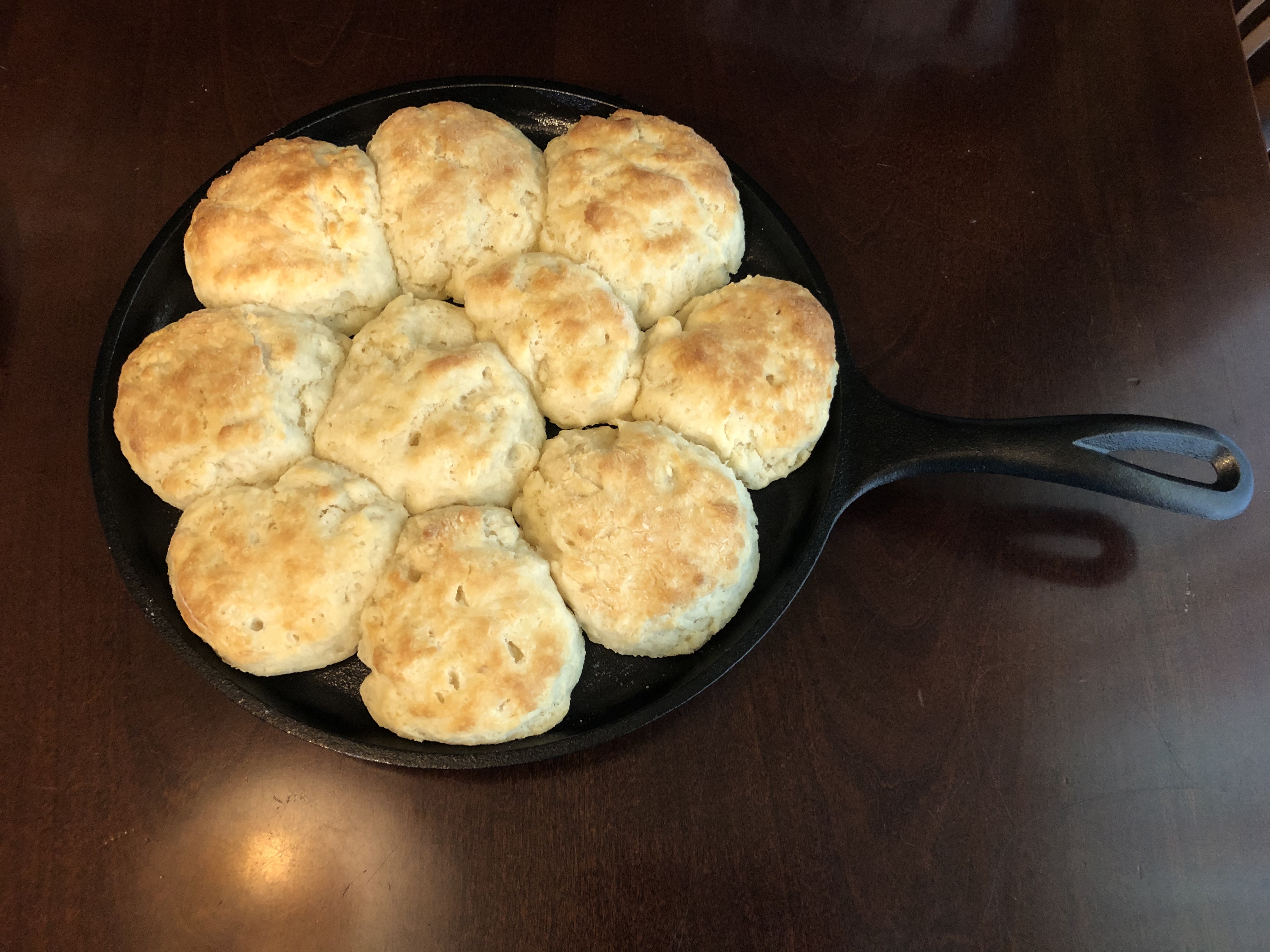 My second attempt produced a fluffier product but they were still flat and not at all like what I remember from the fantastic biscuits Granny, Dad, and Jean made. I watched more videos and bought a Lodge 10-inch griddle – the kind with a handle to make it easy to put it in and remove it from the oven – and tried once more.
